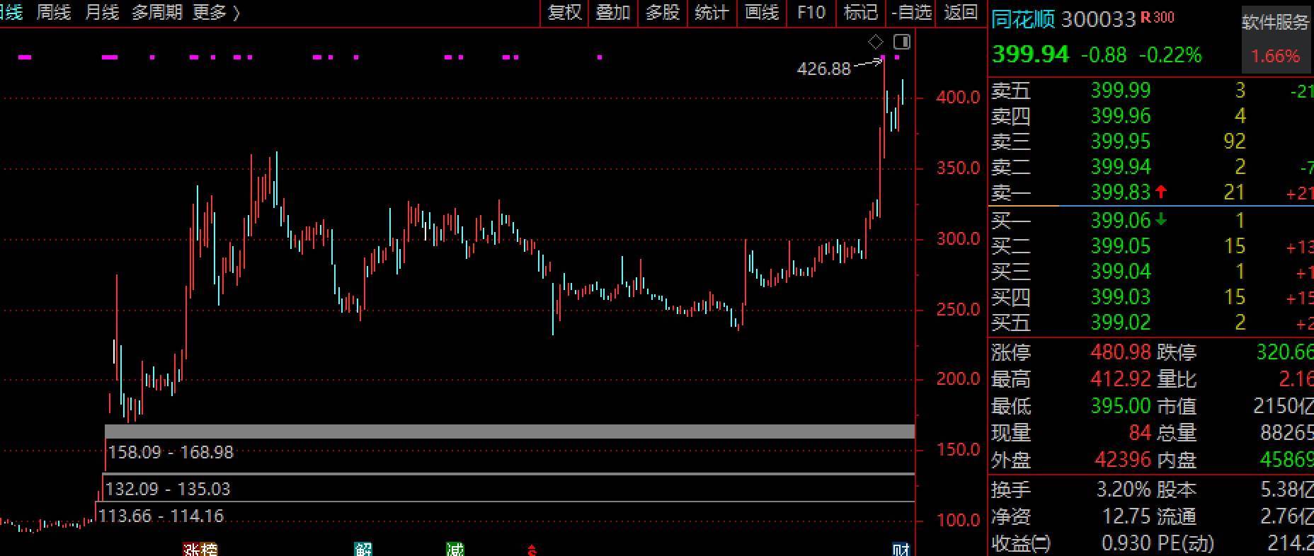 周一,互联网金融龙头同花顺继续上探,早盘最高至412.92元,成交额超25亿元,市场交投较为活跃。